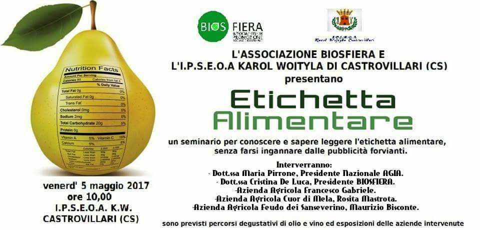 Venerdì 5 maggio, presso l'I.P.S.E.O.A. Karol Wojtyla l'associazione BIOSFIERA presenterà la seconda giornata de "BIOSFIERA ALL'ALBERGHIERO": in questa occasione si parlerà di come leggere correttamente sia l' etichetta alimentare che quella nutrizionale di un prodotto alimentare; inoltre saranno presenti più aziende del territorio che oltre a raccontare la loro realtà ai ragazzi, esporranno i loro prodotti. in ultimo ci saranno i laboratori di olio e vino. Parteciperanno alla discussione la Dottoressa Maria Pirrone, Presidente Nazionale AGIA e la Dottoressa Cristina de Luca, Presidente di BIOSFIERA.